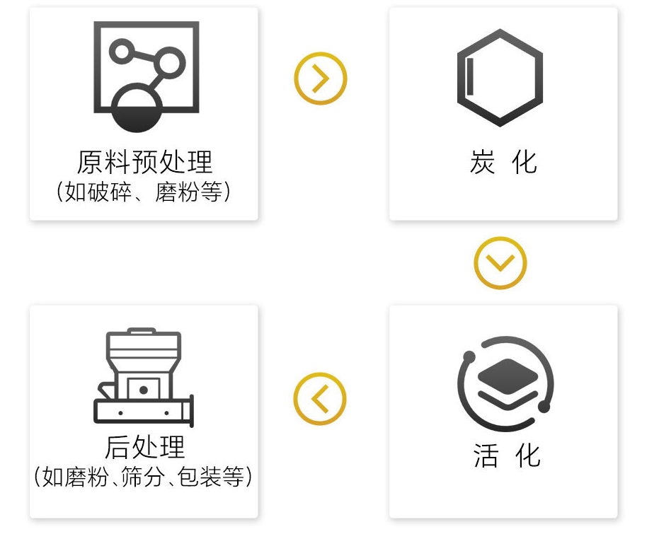 (一)、活性炭生產常見流程:原料預處理(如破碎、磨粉等)→炭化→活化→后處理(如磨粉、篩分、包裝等)