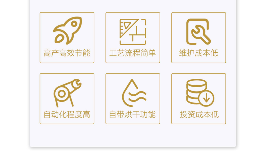 優勢特點:、高產高效節能、工藝流程簡單、維護成本低、自動化程度高、自帶烘干功能、綜合投資成本低